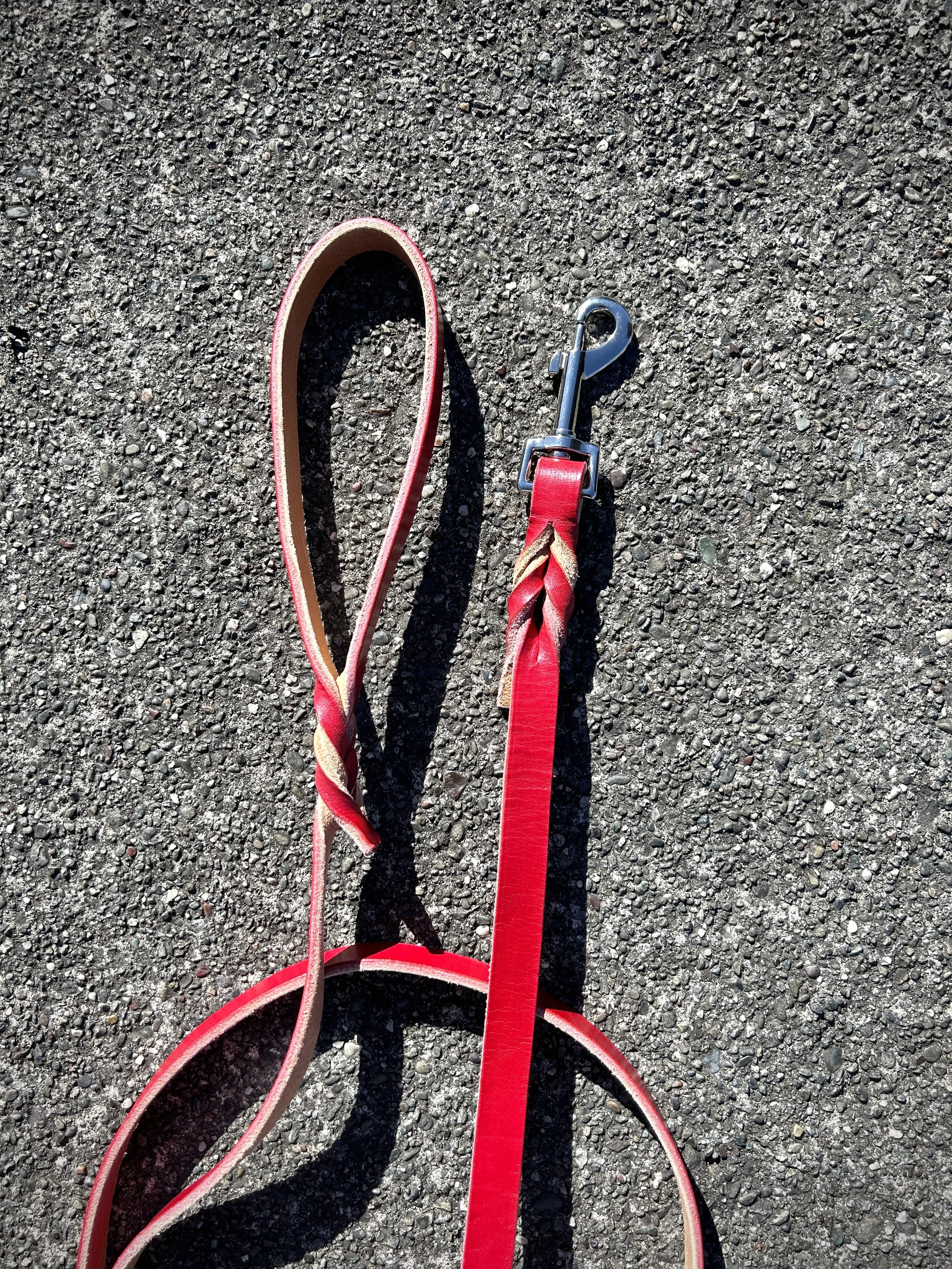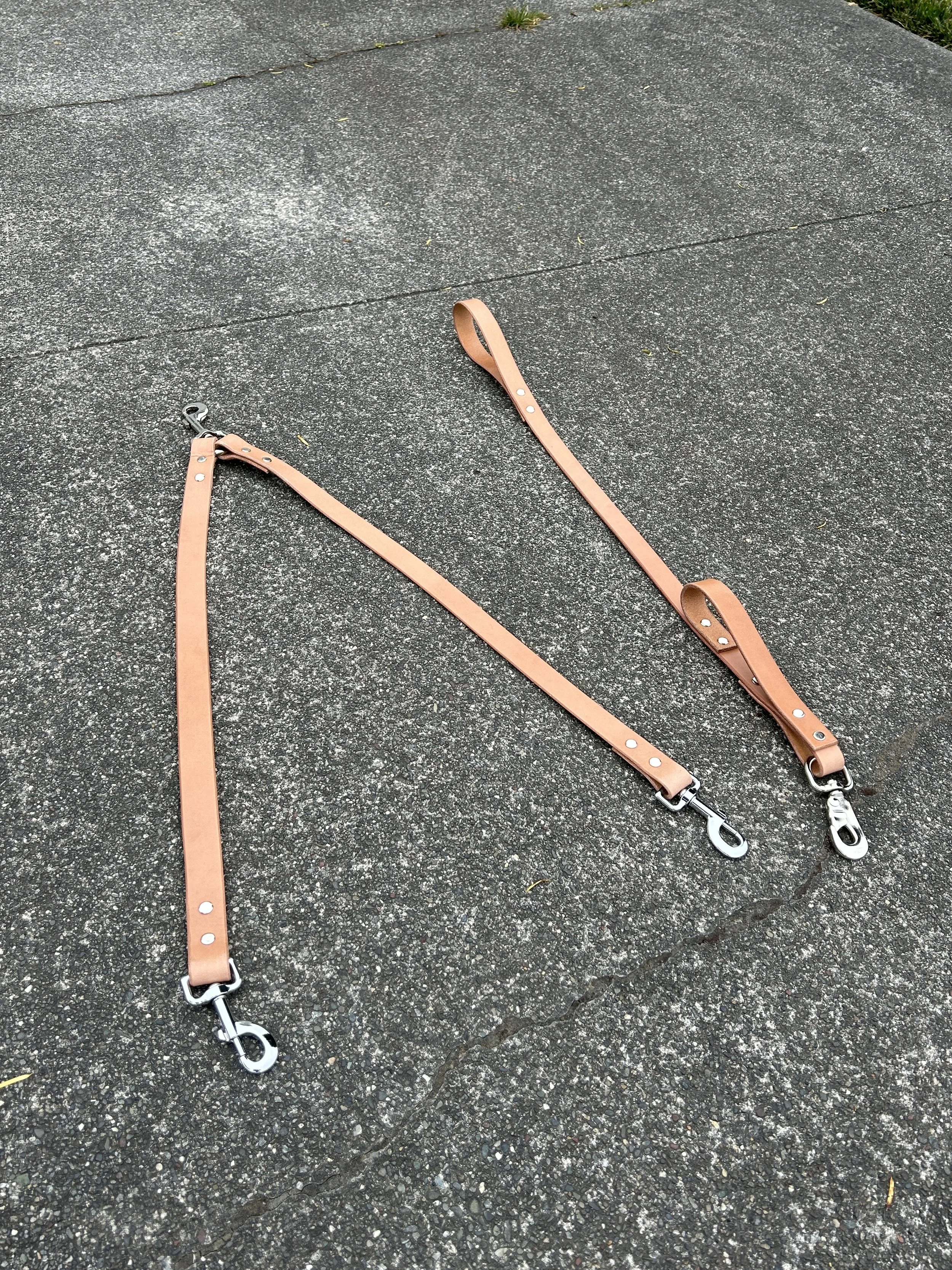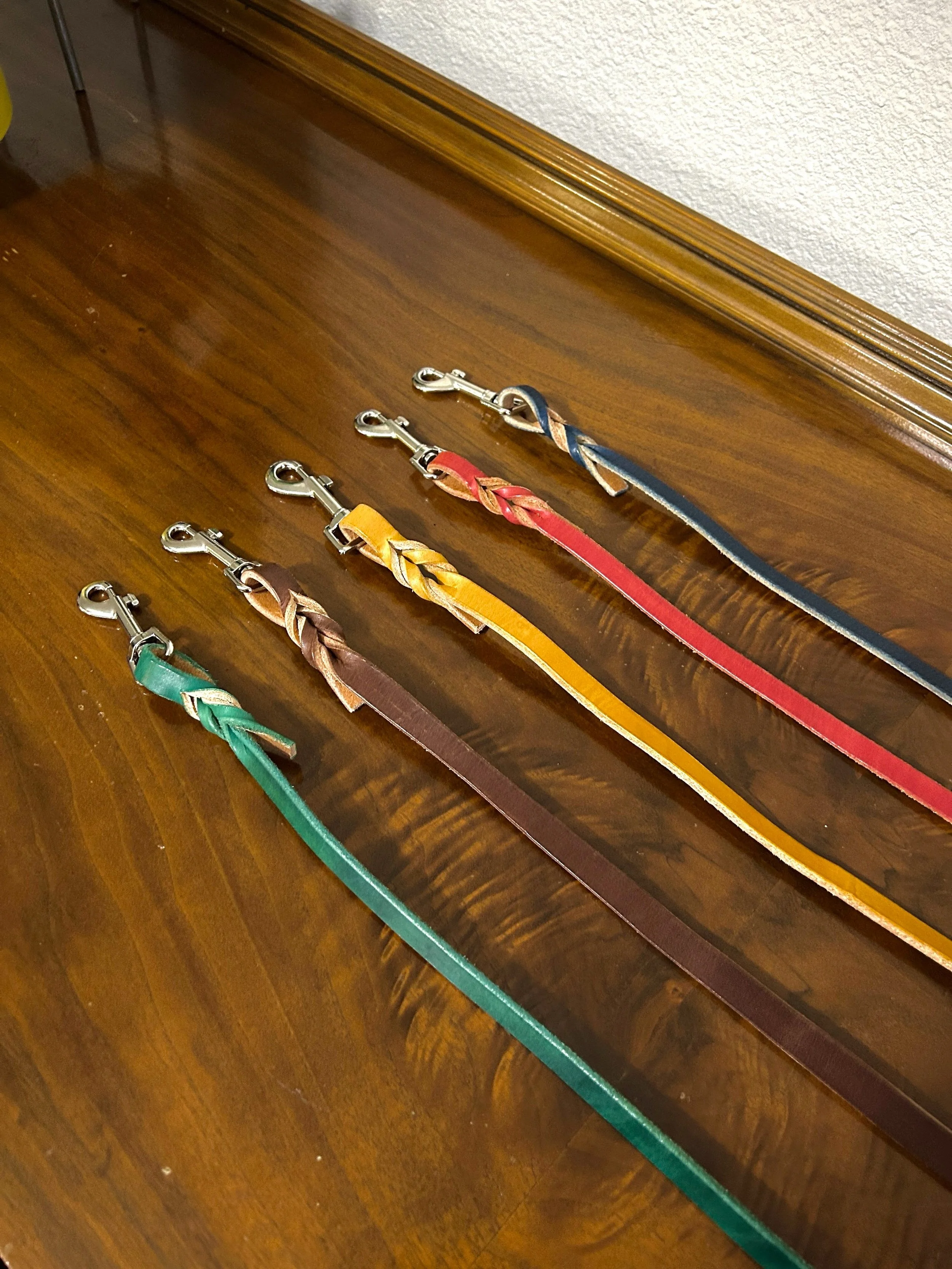 Leashes are made from 9oz-10oz full grain cow hide and feature a six inch handle loop with nickel plated swivel snaps. Several designs and colors available.