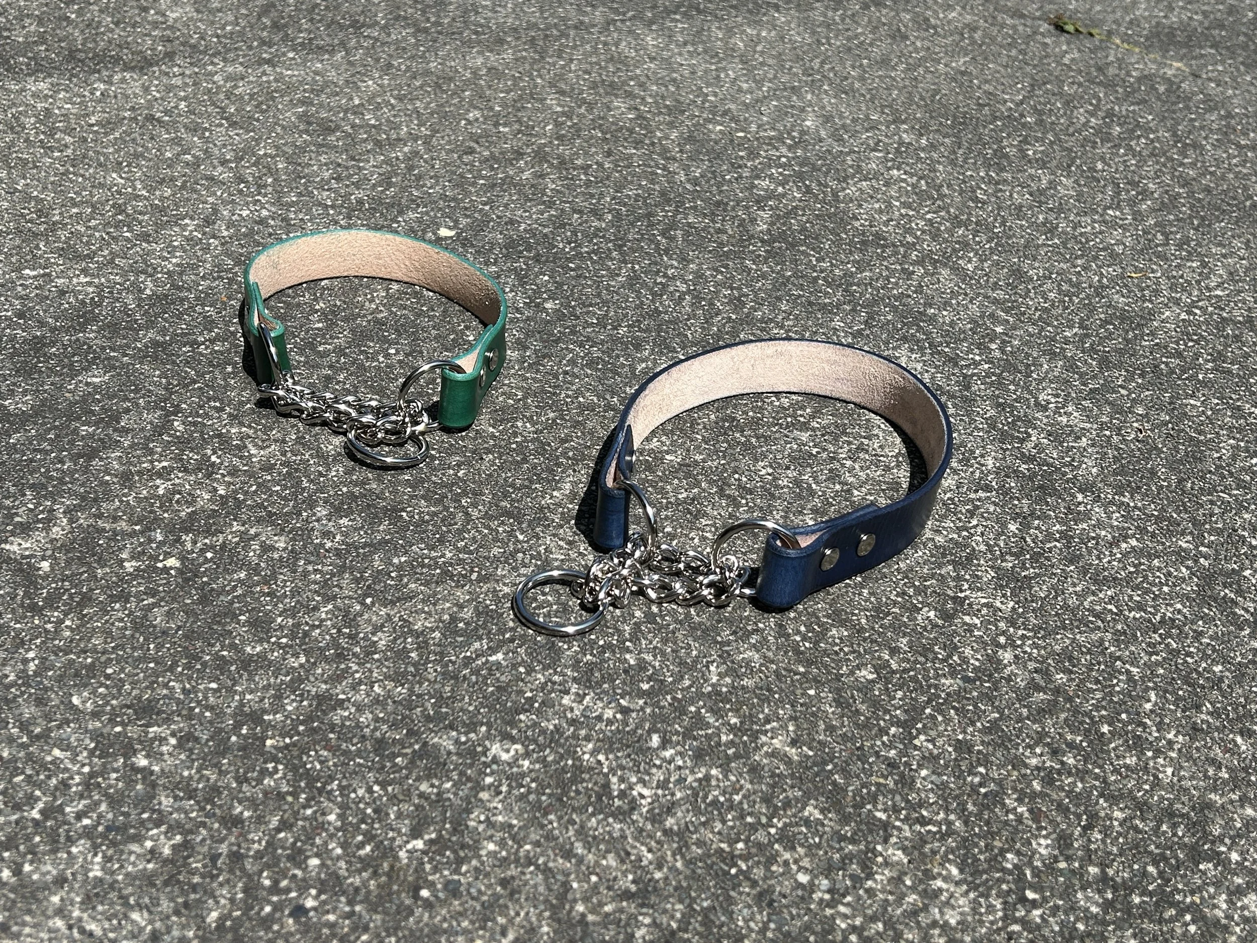 Martingale Collars are made from 7oz-8oz full grain cow hide. They feature a fixed-length half check chain fastened with Chicago screws. Small, medium, and large half check chain sizes in a variety of colors are available.